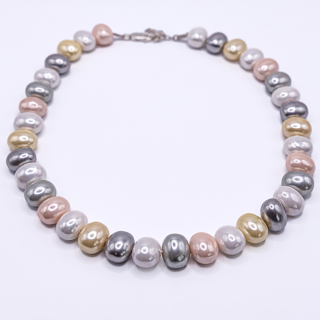 שרשרת עשויה מצדף מצופה פנינה בגוונים רכים של זהב, כסף וורוד, היוצרים משחק עדין של אור וזוהר. פריט אלגנטי ומלא נוכחות שמוסיף עומק לכל הופעה.